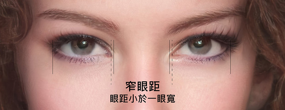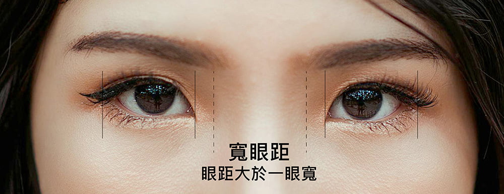 以兩眼內眼角距離等於「一眼寬度」作為基準,若眼距明顯大於一眼寬度,可視為偏寬的眼距,若眼距明顯小於一眼寬度,可視為偏窄的眼距。