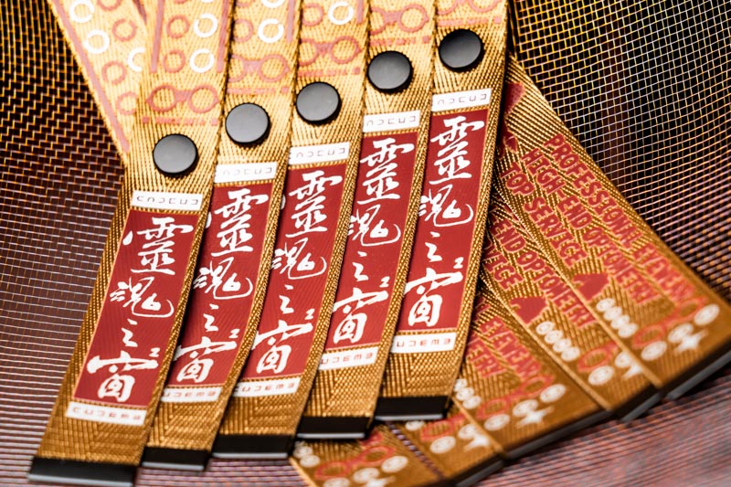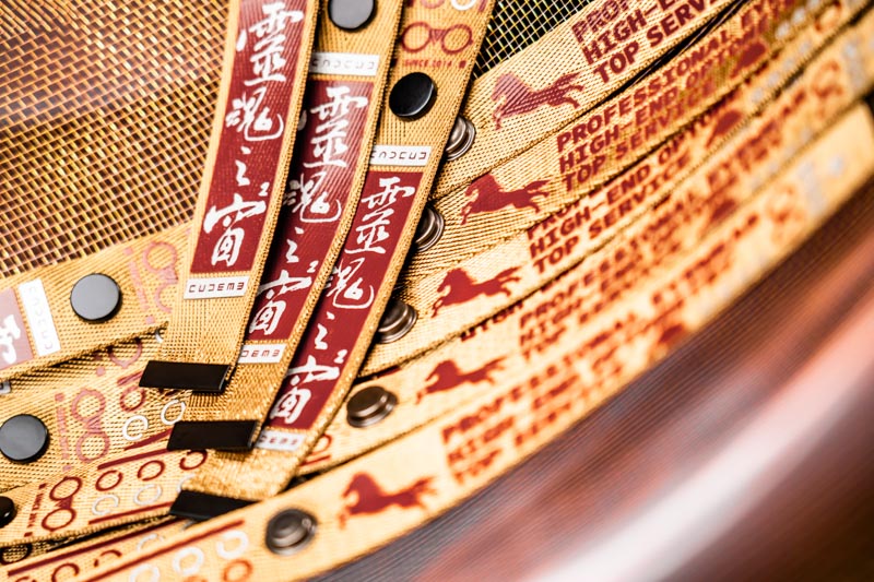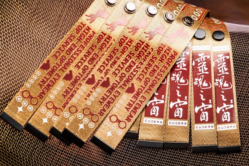 溫潤金色織帶,搭配暗紅印刷細節,