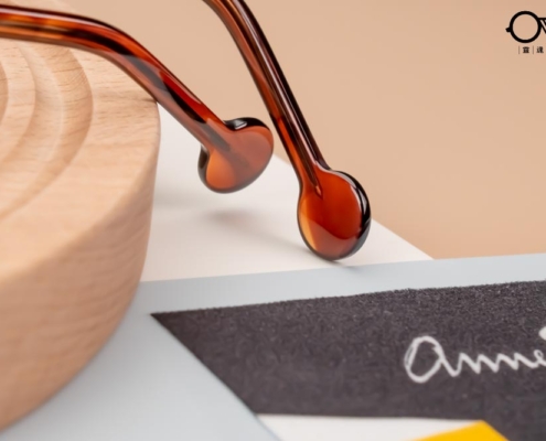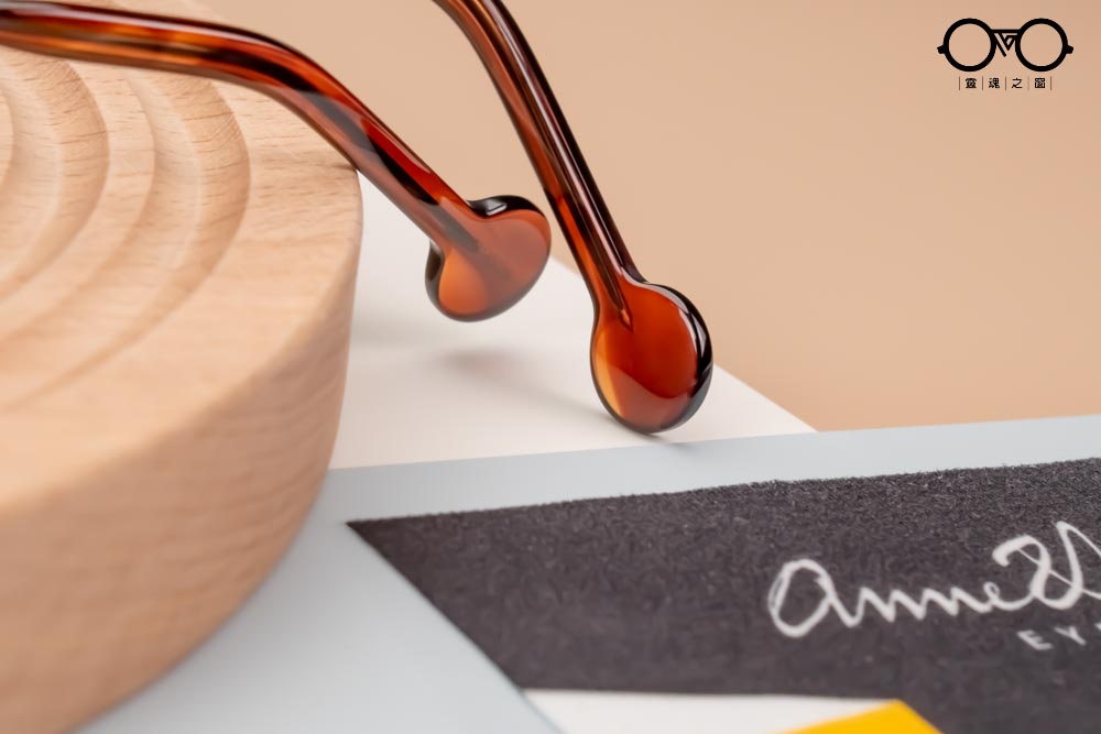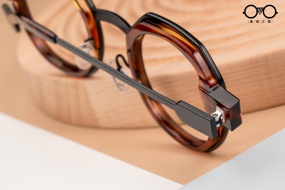 金屬鏡腳作扁平設計,後半段套上可供調節的醋酸纖維板料鏡腳套,鏡腳末端圓潤而扁平,與庄頭的方正造型,形成有趣的對比設計感,很適合偏窄的臉型,與鼻樑較低的人配戴。