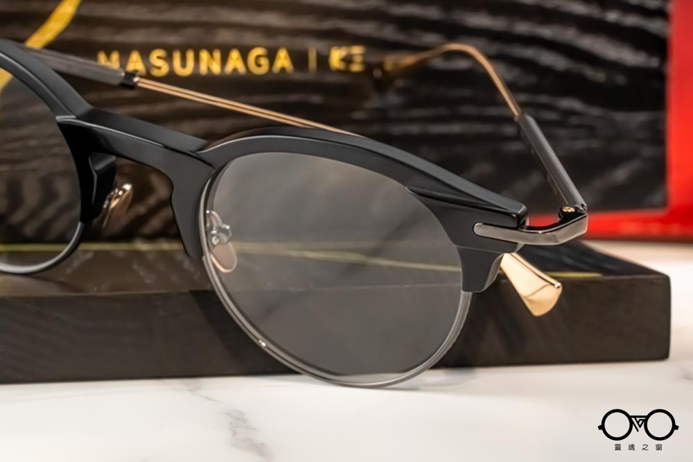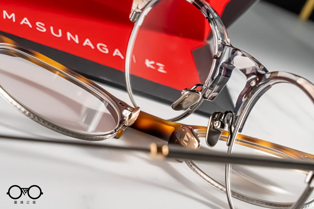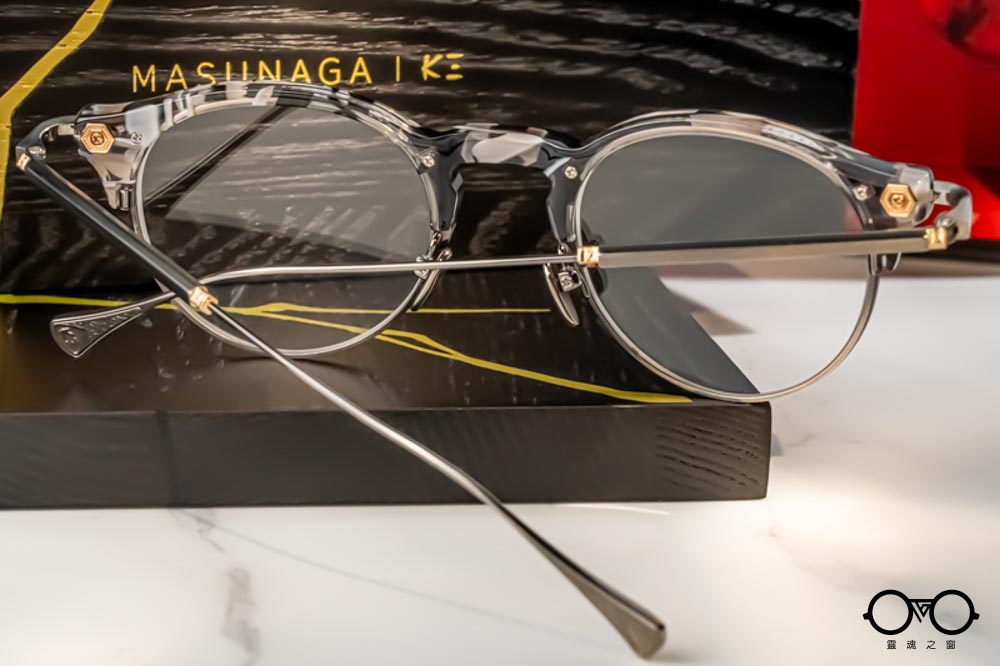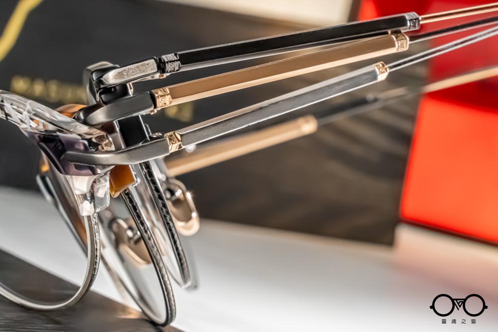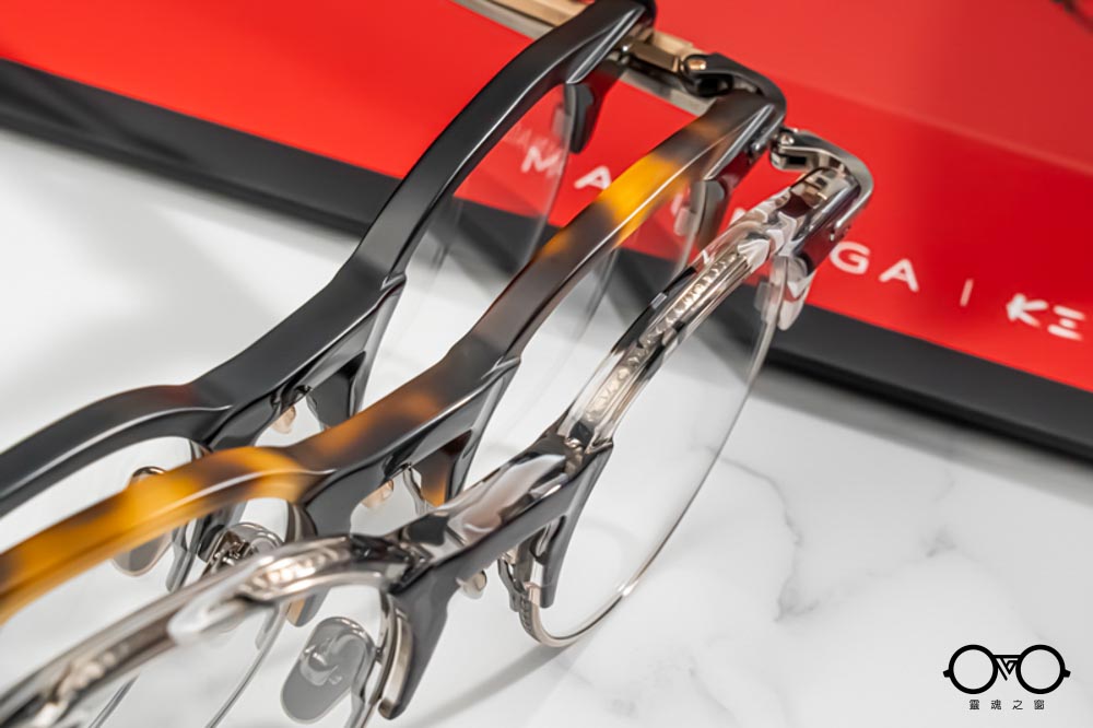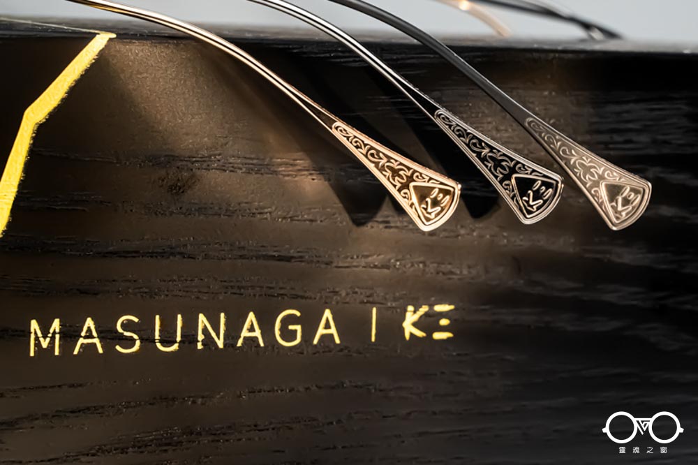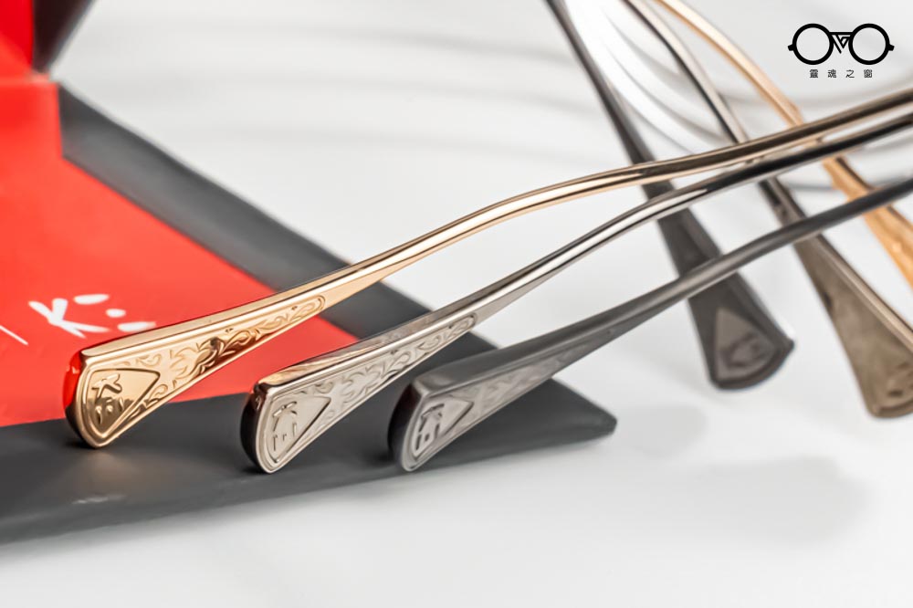 鏡腳前端延續K3經典的六角立體設計,頭尾兩端以帶有精緻雕刻的金屬元件華麗點綴。鏡腳中段細緻,延伸至末端成扁平扇狀設計,外側帶有K3 logo與日式雕花紋理;亮、霧面與異色細節交錯呈現,展現MASUNAGA x K3的精緻設計與手作底蘊。