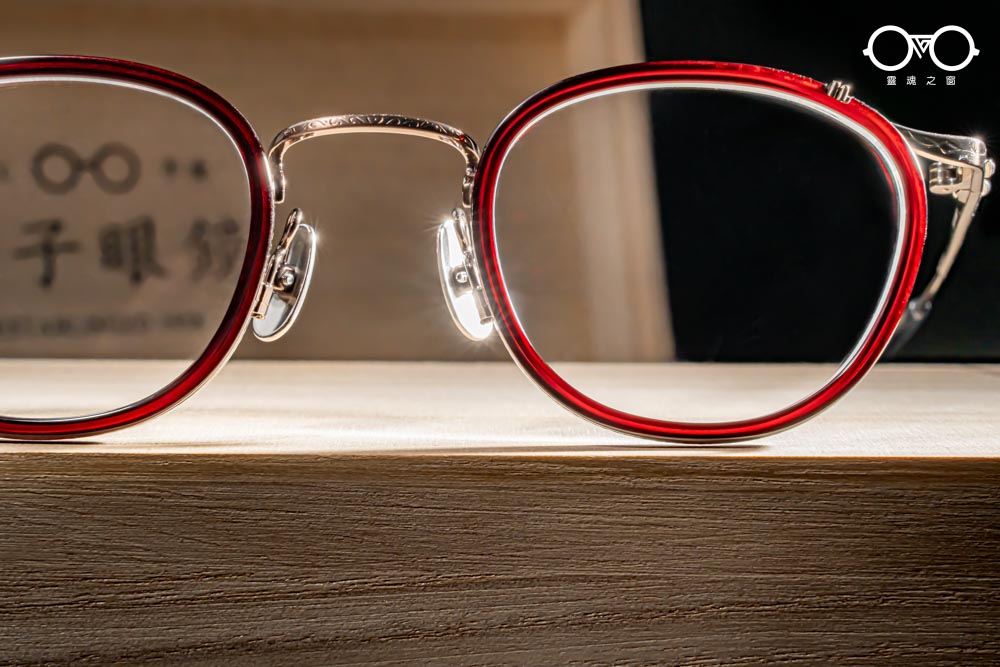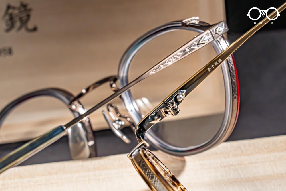 細緻的中樑結構密佈著精美刻紋,焊接於鈦金屬鏡圈,鈦製鼻墊可供調整,幫助配戴時舒適貼合鼻樑,材質堅固耐用,不致肌膚過敏,不易鏽蝕、不生銅綠。