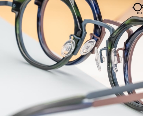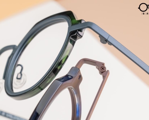 以輕量級日本鈦金屬打造純粹而高品質的美感,與醋酸纖維板料鑲嵌,不同材料密度的結合需要極精確的計算,構成特別的拼接風設計。