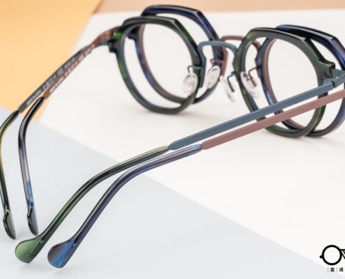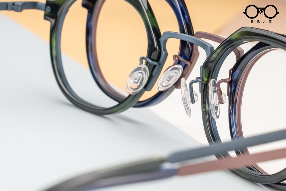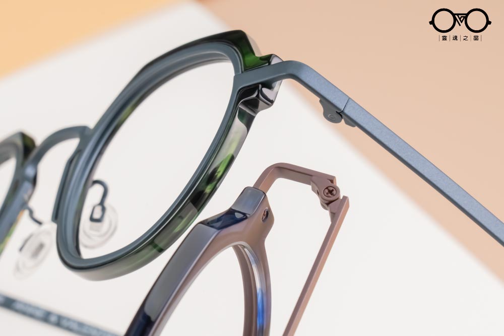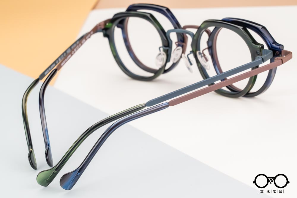 呼應醋酸纖維板料的不規則稜角框型,與圓潤鈦圈緊密鑲嵌,