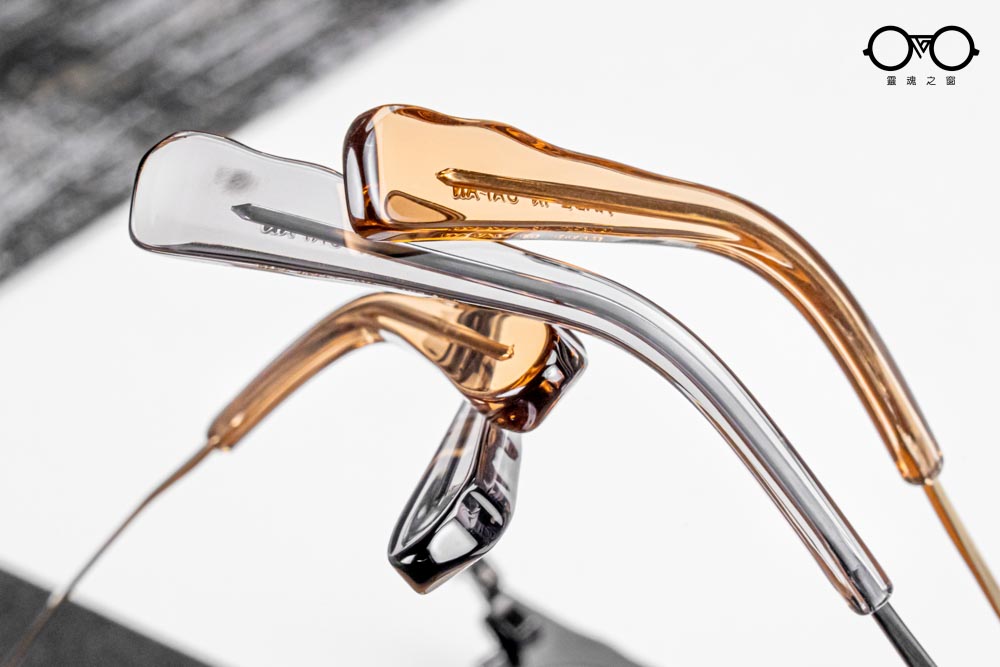 後段套上厚實粗曠的醋酸纖維板料鏡腳套,邊緣展現十足雕刻力道,透色設計讓整體在視覺上不過於沈重負擔,延續著不對稱的風格,讓整體展現相當特別,透出鏡腳蕊芯的設計也加成了堅韌紮實的結構質感。