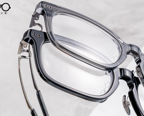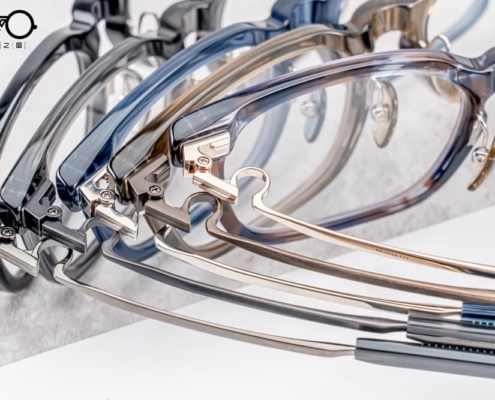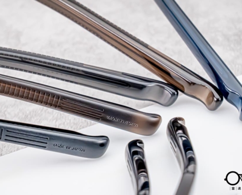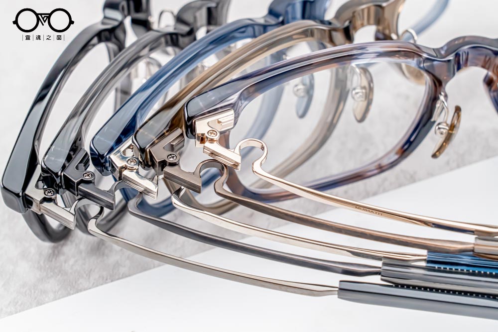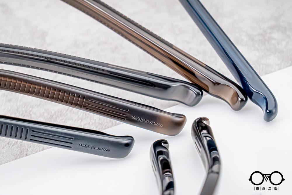 鏡腳做環抱式設計,帶來穩定而舒適的貼合感。鈦鏡腳纖細且兼具彈韌性,有精緻亮面與復古消光的風格呈現,搭配醋酸纖維板料材質作配色設計,末端長條的防滑梳紋設計,增進配戴時的穩定安心感。