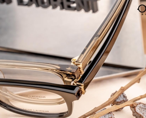 配置Monogram鉸鏈將YSL logo以立體造型呈現,鏡腳彎摺與打開時,呈現精密接合的設計感,為整副鏡架上最精緻突出的亮眼點綴。