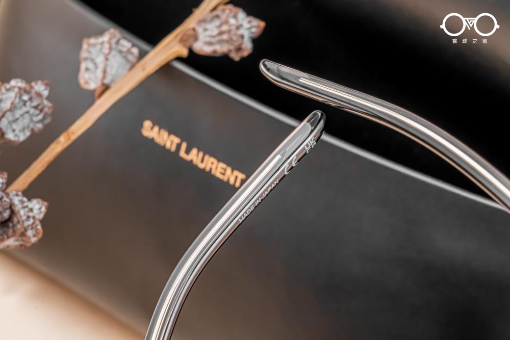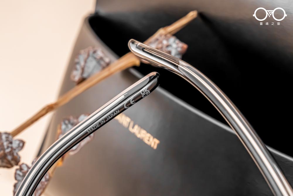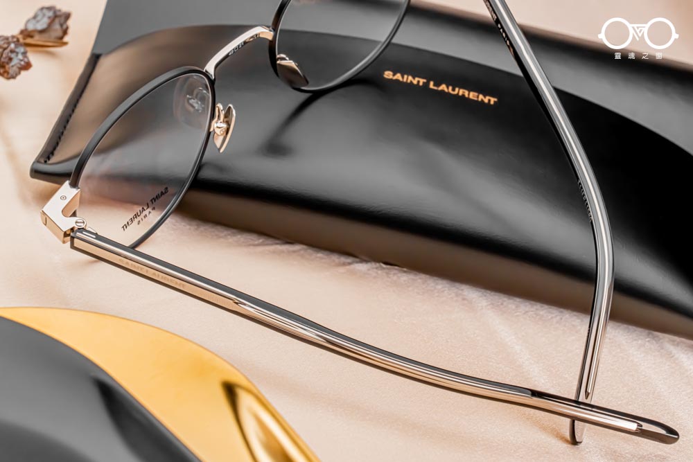 鏡腳外側質感晶透,清晰透出銀色金屬蕊芯,於前框庄頭處裝配金屬直角飾片,內側為實色黑,帶來俐落感,整體展現出異材質與雙色彩的層次對比,讓 SL781 在簡約的基調中,多了一份耐人尋味的設計亮點,低調卻不失存在感。