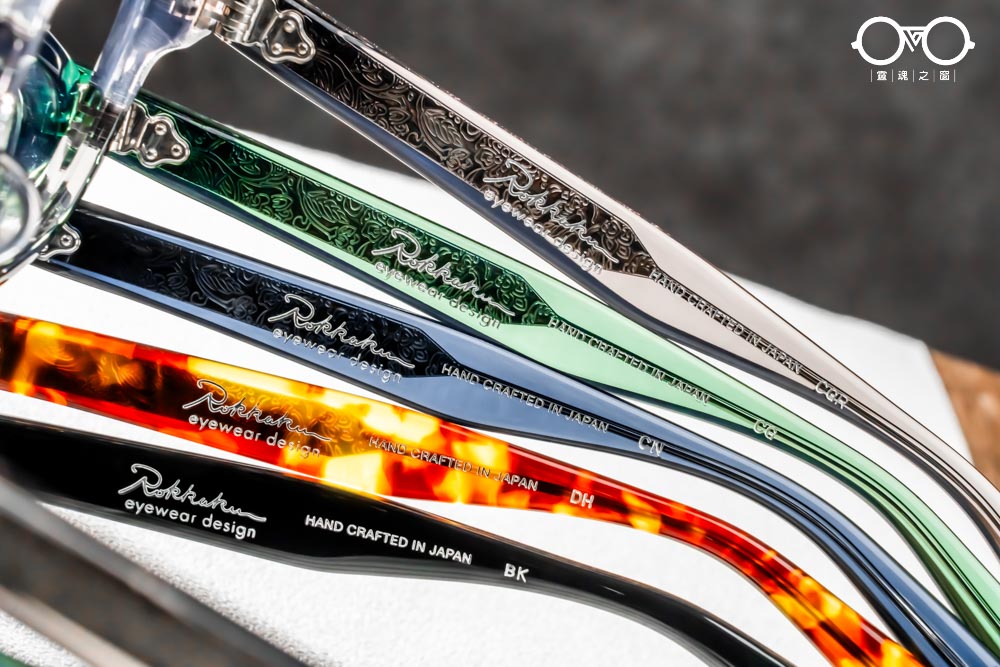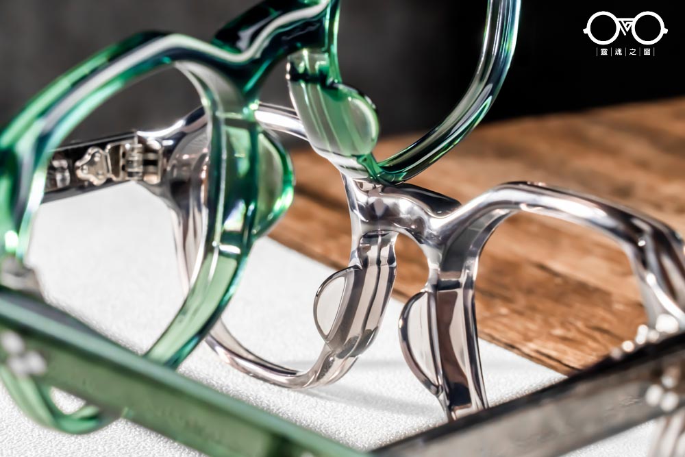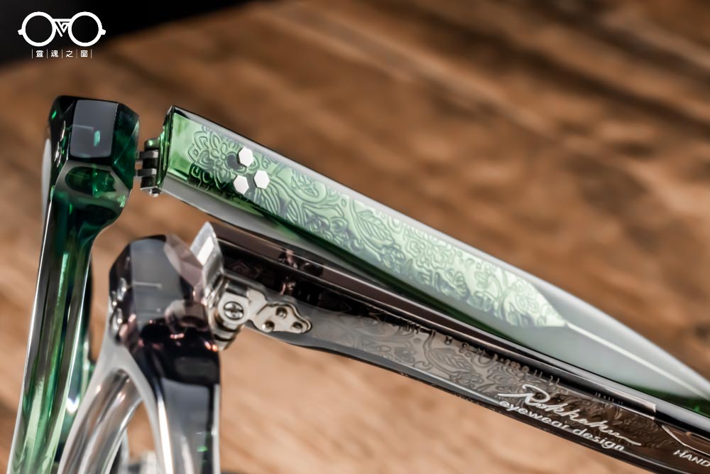 鏡腳內嵌厚實的鈦金屬蕊芯,隨著各色鏡腳透出蕊芯,傳遞出不同風格氛圍的特色,其傳統而華麗生動的雕花刻紋,展現鯖江職人非凡且嚴謹的工藝質感,鏡腳整體的搭配也為眼鏡增添強大的氣勢風采,並適時地收攏成極細的造型,一路向後延伸,避免過於沈重的感受,增進精緻細膩的氛圍。