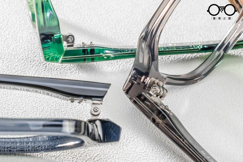 庄頭處與鏡腳前端各鑲嵌三個六角形金屬飾片,亮麗點綴精緻感,突顯新意,藉由透色的醋酸纖維板料鏡腳,帶來豐富多層次的視覺美感,從鏡腳側面也能深刻感受異材質色彩的層次魅力。